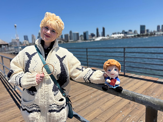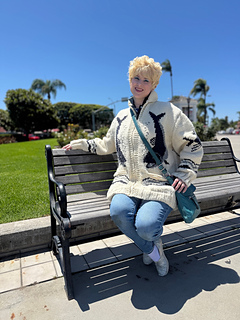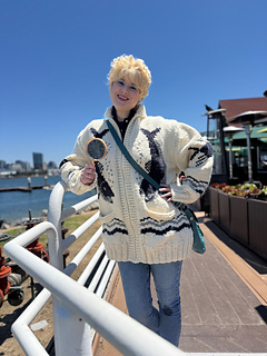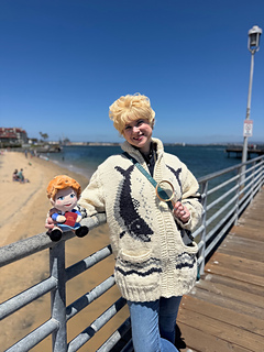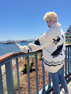 Finished left body piece. Just the other arm to make now! I also noticed on the actual MSW sweater, the fish are swimming the same direction! So the pattern doesn’t match the sweater on the show. (the fish nose always points right)