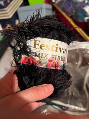 “Festival Mix Fiber” is a catch-all label for remaindered or discontinued yarns in odd balls. Textures range from ordinary plied acrylic/polyester worsted to eyelash to chenille and many other novelty yarns. Each ball is labeled with the weight (50 grams) and washing instructions (hand wash). Since yardage and gauge vary widely, however, no information about them is given on the ball band.