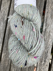 Tweed DK yarn and the coloured bits are our own hand-dyed waste - the ties that we take off the hand dyed skeins. We save them very diligently and it’s a total labour of love!