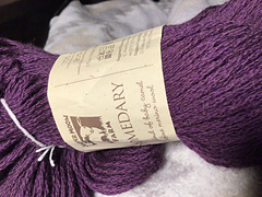 70% Merino Wool, 30% Camel with approx 290 yards per 100g that knits to 5.5 sts per inch on a US 6 needle.