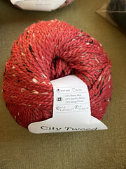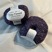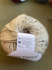 “This yarn begins with alpaca and Merino fibers dyed two different colors and then blended together to make a subtly rich, lustrous heather. We chose neutral colored donegal tweed neps to incorporate into the 2-ply yarn. The high ratio of neps gives City Tweed a traditional appeal. The use of Merino and alpaca makes it soft and warm.”