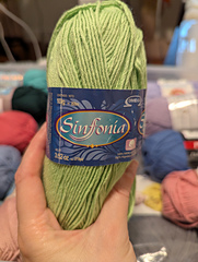 Sinfonia is a 6 ply 100% mercerized cotton, comes in a 218 yard 3.52 oz. skein, and 89 colors.