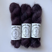 The combination of mohair and silk creates a shiny, airy, strong fiber. The dye takes to both very well and we are always fascinated by the way it takes to our colors. The silk core sometimes glows amid the wispy mohair. Fae can be used alone or paired with any other fiber to create something luxurious.