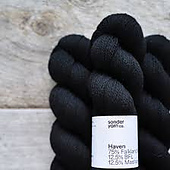Haven is versatile and can be used alone for a lace or light fingering weight gauge, held double with itself for a sport weight gauge, or paired with Halo to produce a delicate, lightweight fabric with a gorgeous drape and soft, cloud-like halo.