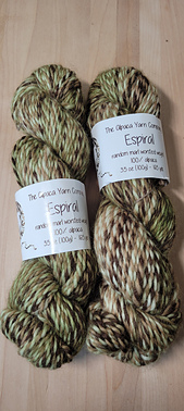 Espiral is soft worsted weight yarn that gives the look of a random handspun skein. This beautiful yarn is 100% alpaca in a worsted weight. Each 100 gm. skein is approximately 165 yards. The gauge is approximately 20 st / 4” (5 st/1”) using US #8 (5.0mm) needles. Each skein will be somewhat different.