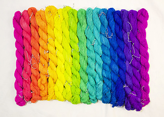 I’ve hand dyed this lovely, lace weight yarn in 17 of my classic neon colors, many of which are true fluorescent colors and glow under blacklight.